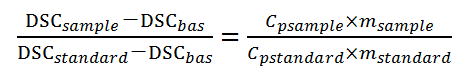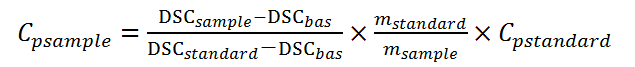 將試樣與一已知比熱容的標(biāo)準(zhǔn)物質(zhì)(藍(lán)寶石,主要成分為Al2O3)在其他條件相同下進(jìn)行溫度(線(xiàn)性增大)掃描,然后量出二者的縱坐標(biāo)(DSC信號(hào)),根據(jù)下列公式進(jìn)行計(jì)算。