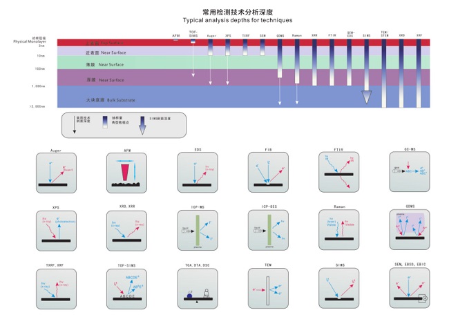 利用電子、光子、離子、原子、強(qiáng)電場(chǎng)、熱能等與固體表面的相互作用,測(cè)量從表面散射或發(fā)射的電子、光子、離子、原子、分子的能譜、光譜、質(zhì)譜、空間分布或衍射圖像,表征材料表面微觀形貌、表面粗糙度、表面微區(qū)成分、表面組織結(jié)構(gòu)、表面相結(jié)構(gòu)、表面鍍層結(jié)構(gòu)及成分等相關(guān)參數(shù)。